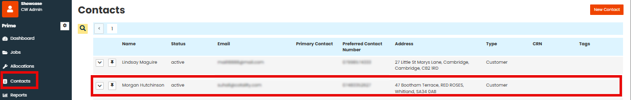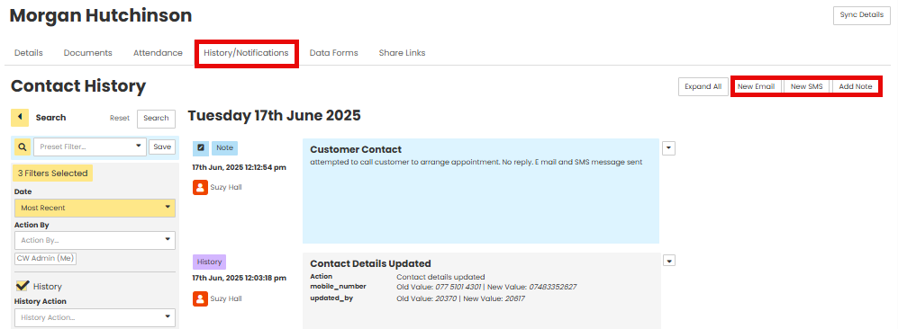 So, if you need to communicate with a contact but not on an individual job level you can email and message them through this section and have a history of any communication. You can also add notes relating to a particular contact.