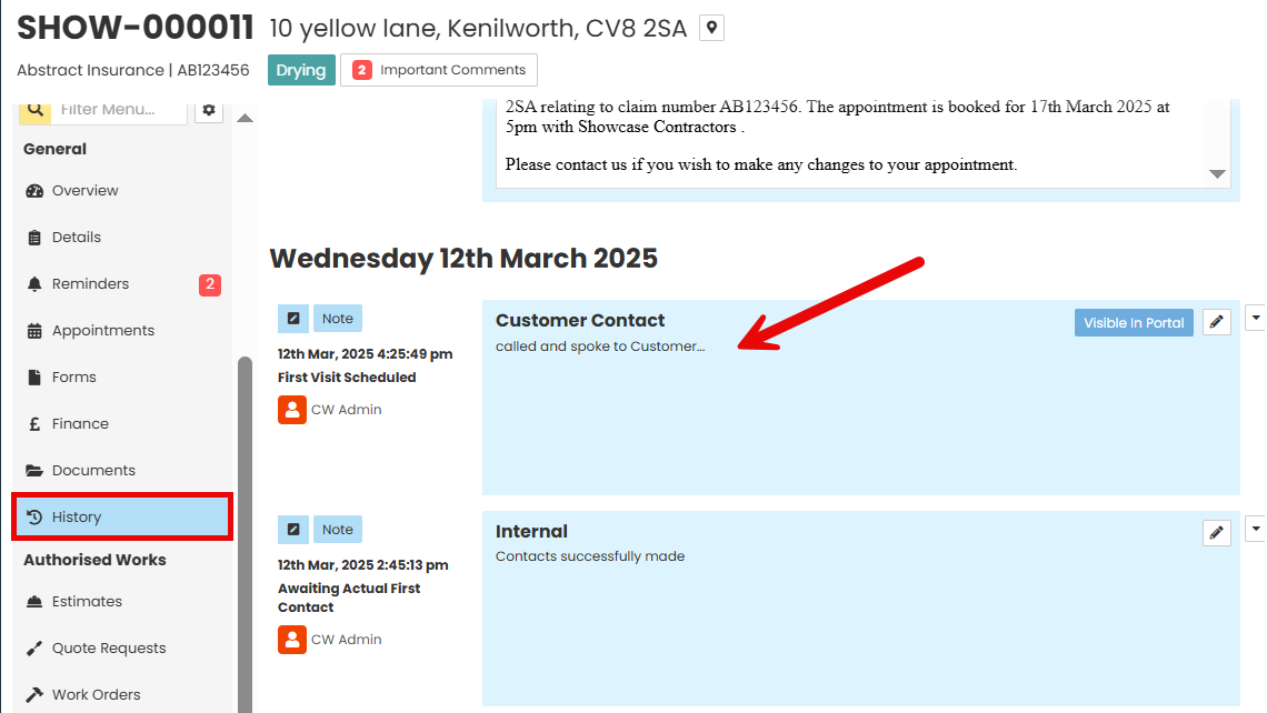 All Notes are added to, and can be viewed in the jobs, ‘History’ tab of the ‘General’ menu.