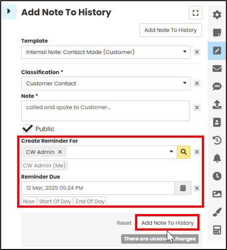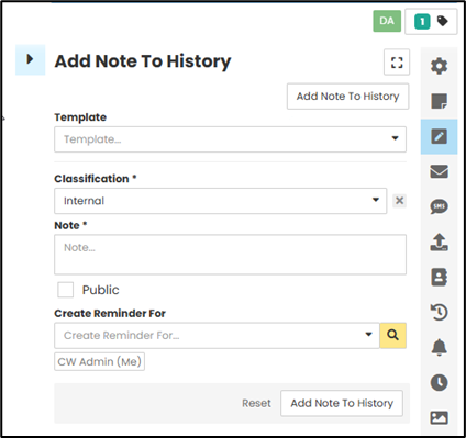 You can also choose to create the note as a reminder for yourself or someone else. Once you have completed the note, select ‘Add Note to History.’