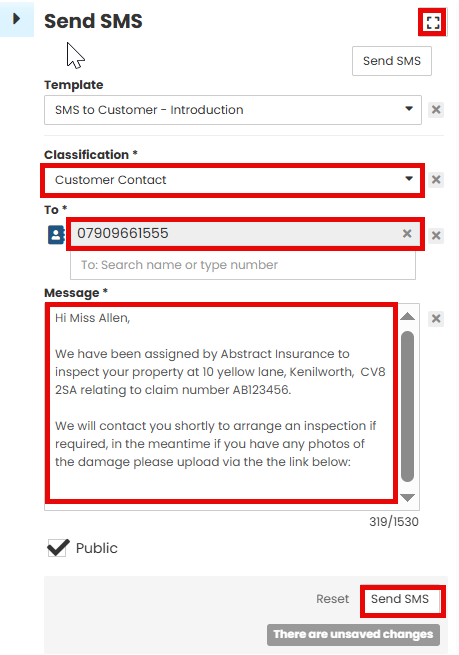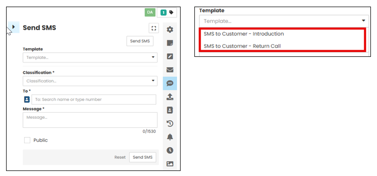 You can select a template using the drop-down list. The template will automatically prefill the mandatory information, such as the Classification, Contact number and Body of the SMS message.