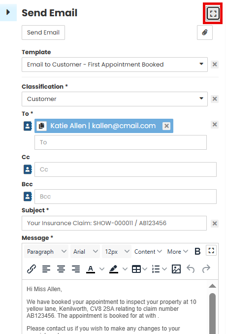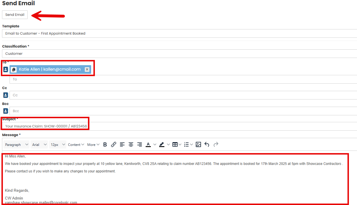 As this email is going to the customer about their first appointment, their information is automatically prefilled, based on previous steps.