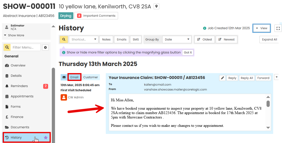 To view any emails that have already been sent regarding a job, from the Job menu select ‘History.’ From here you will see all previous emails that have been sent either to the insurer, customer, or third parties.