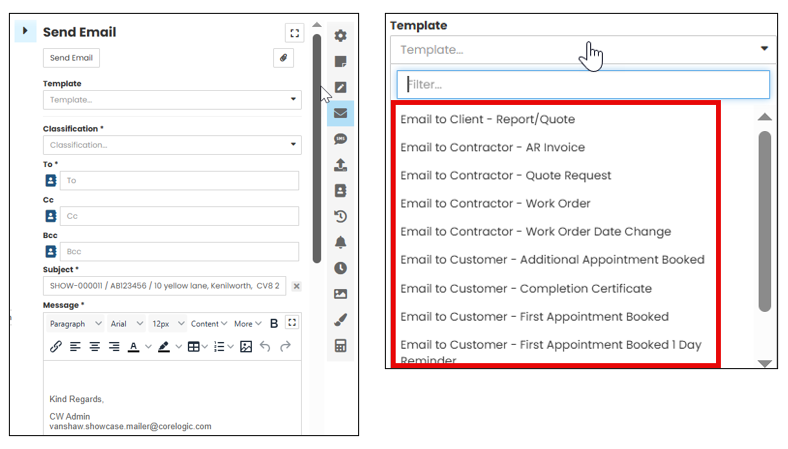 A blade will open out, and you will see the following view. You can select a Template using the drop-down list. The template will automatically prefill the mandatory information, such as the Classification, Email address, Subject and Body of the email.