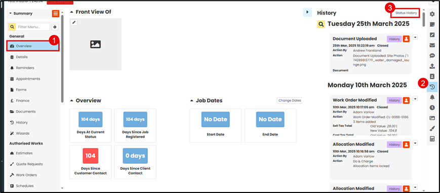 Click the ‘Status History’ button to filter the view to see the Job Status changes by milestone.