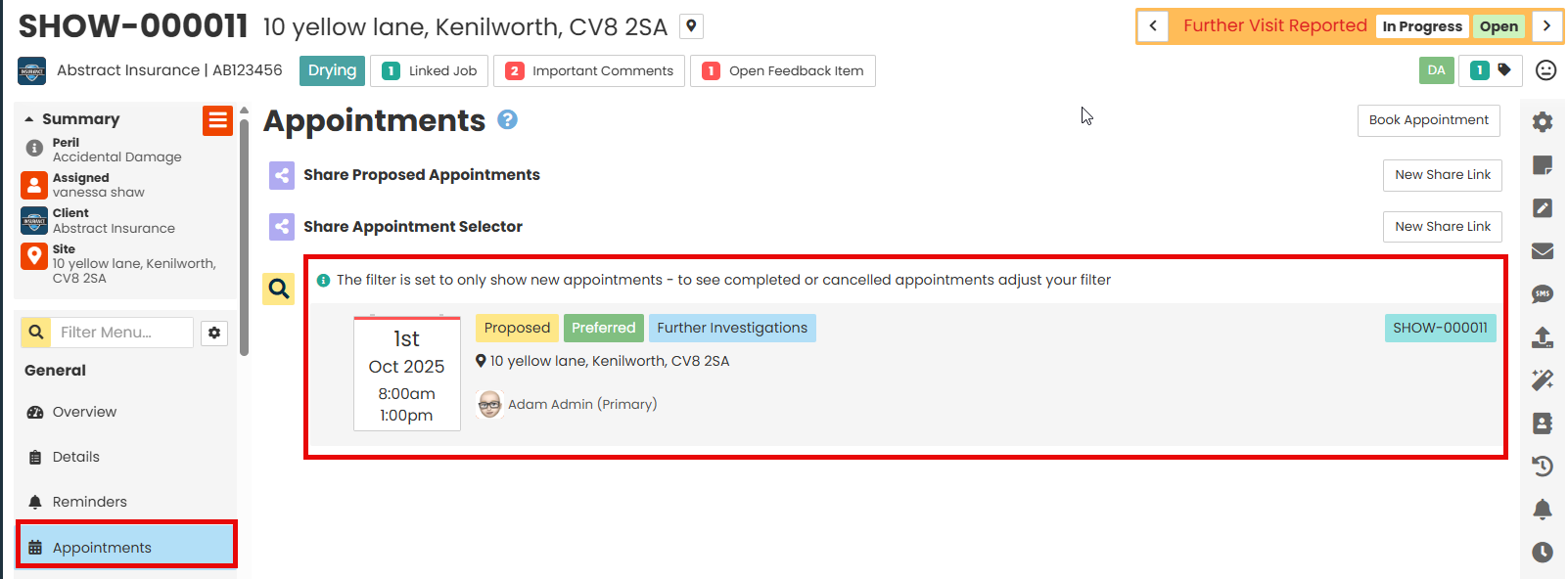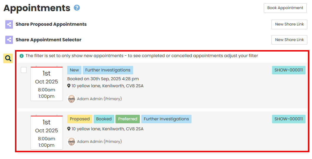 The screen will refresh back to the Appointments page and you will now see the booked Appointment in the list. The Proposed Appointment will still show in the list as well.