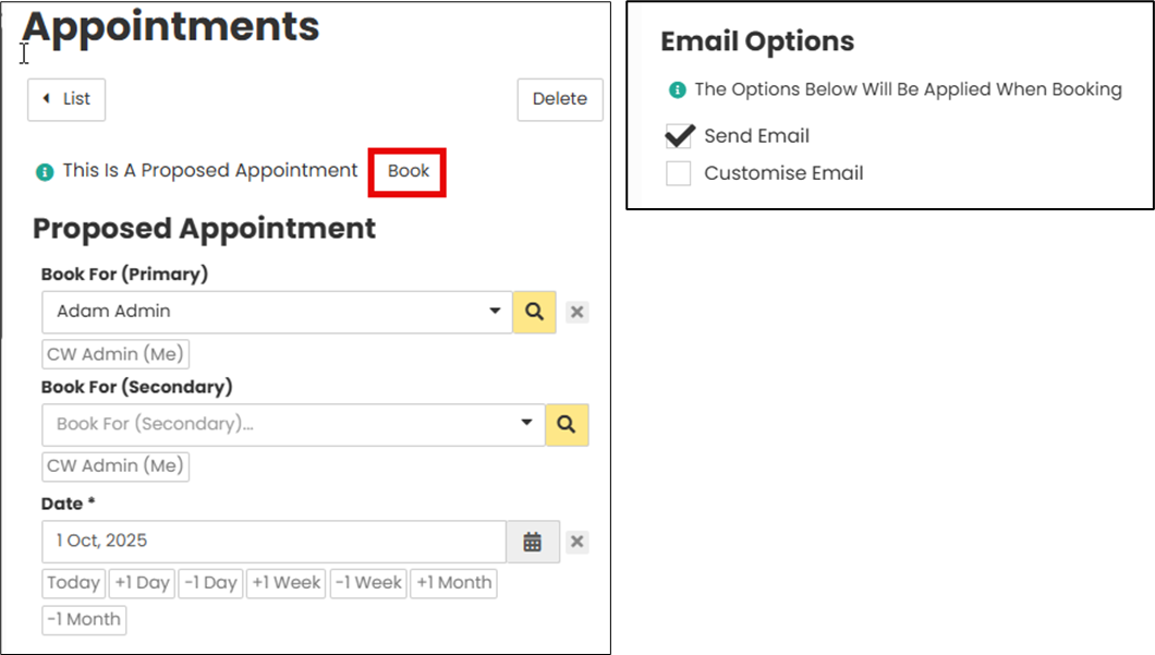 Note - At the bottom of the Proposed Appointment screen ensure you have your Email Options set, once you book the appointment this will trigger the email to be sent.