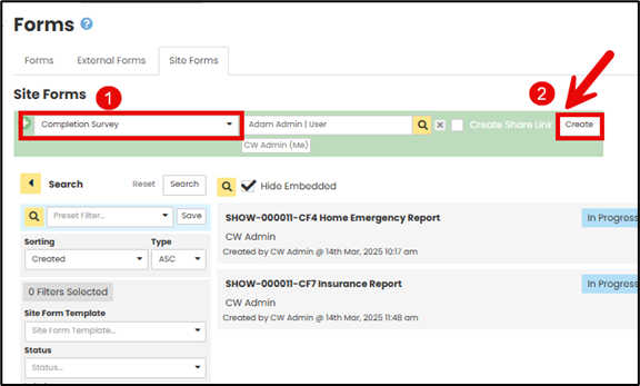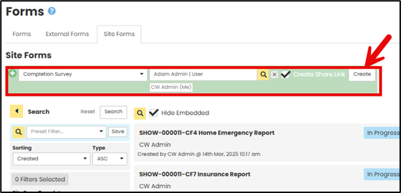 You can also create the Share Link after you've created the Site Form. Select the Site Form in the first drop down, then click ‘Create.’