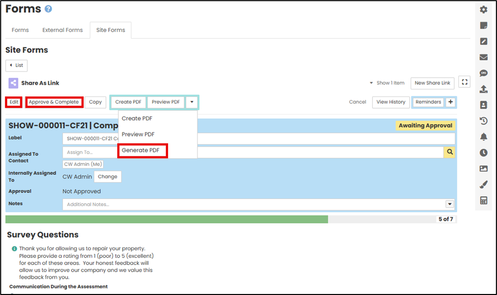 Open the Site Form to Approve & Complete and create PDF or to Edit and adjust any fields as required.