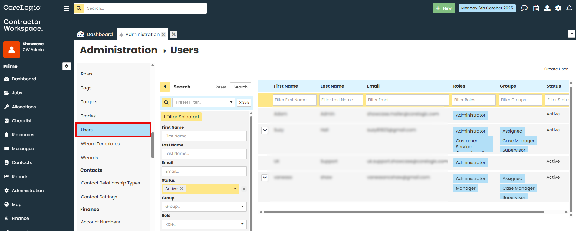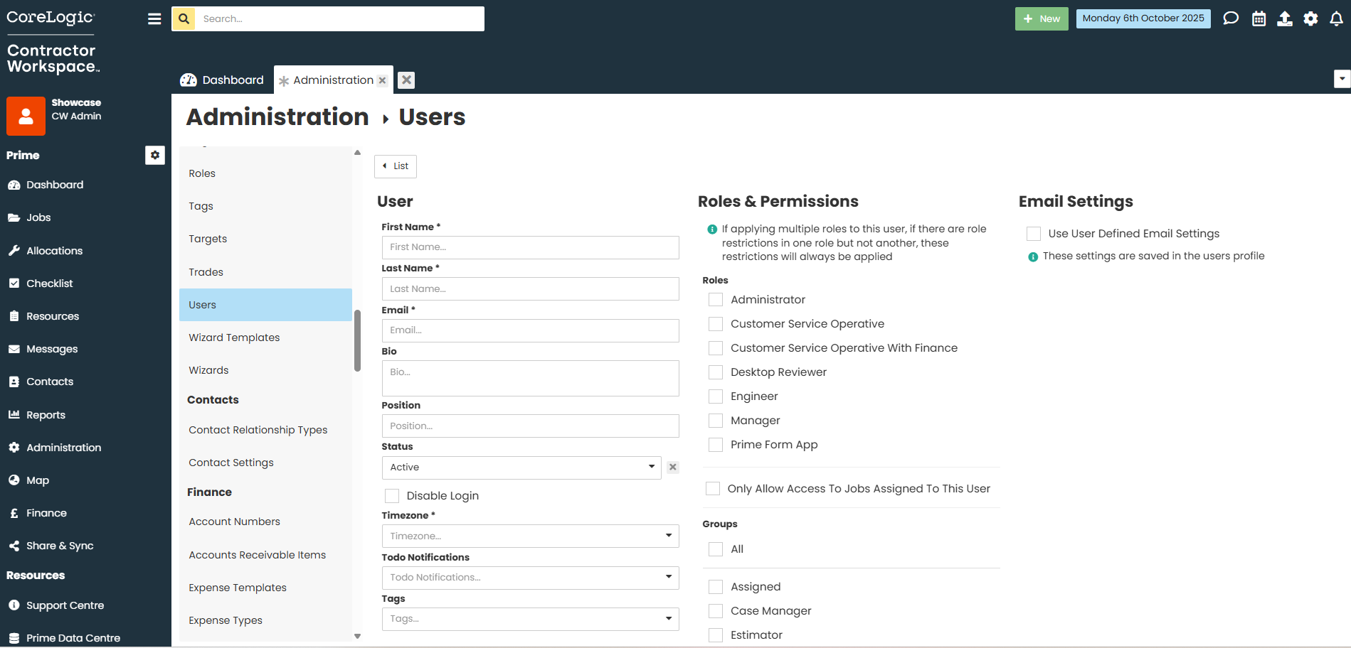 4. Populate the fields as required, all fields with an asterisk are mandatory. Note the new user's email is used to provide login access, send notifications and system communications.