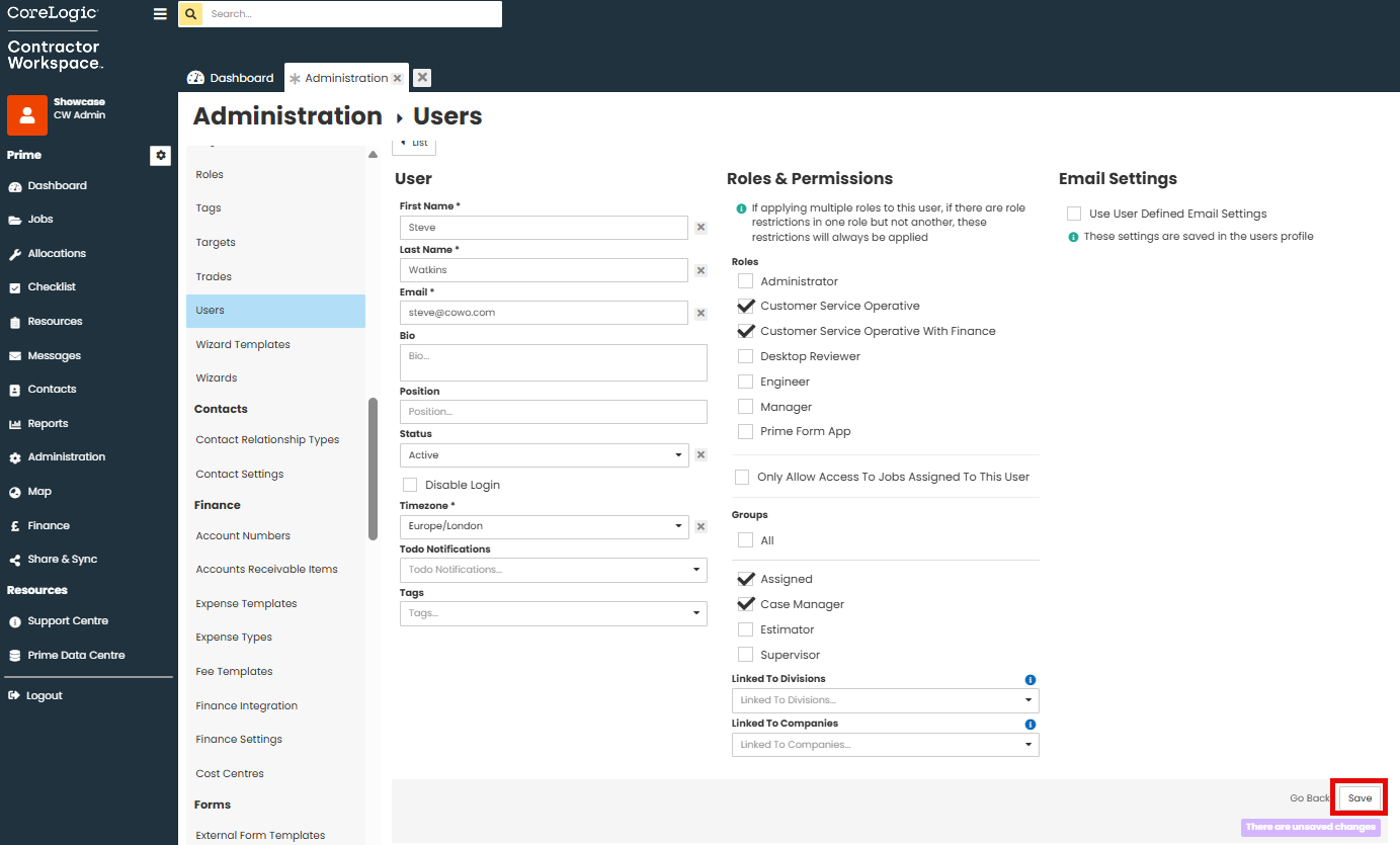 6. Once the Details of the user have been populated and the Roles & Positions and Groups selected click SAVE bottom right of the screen.