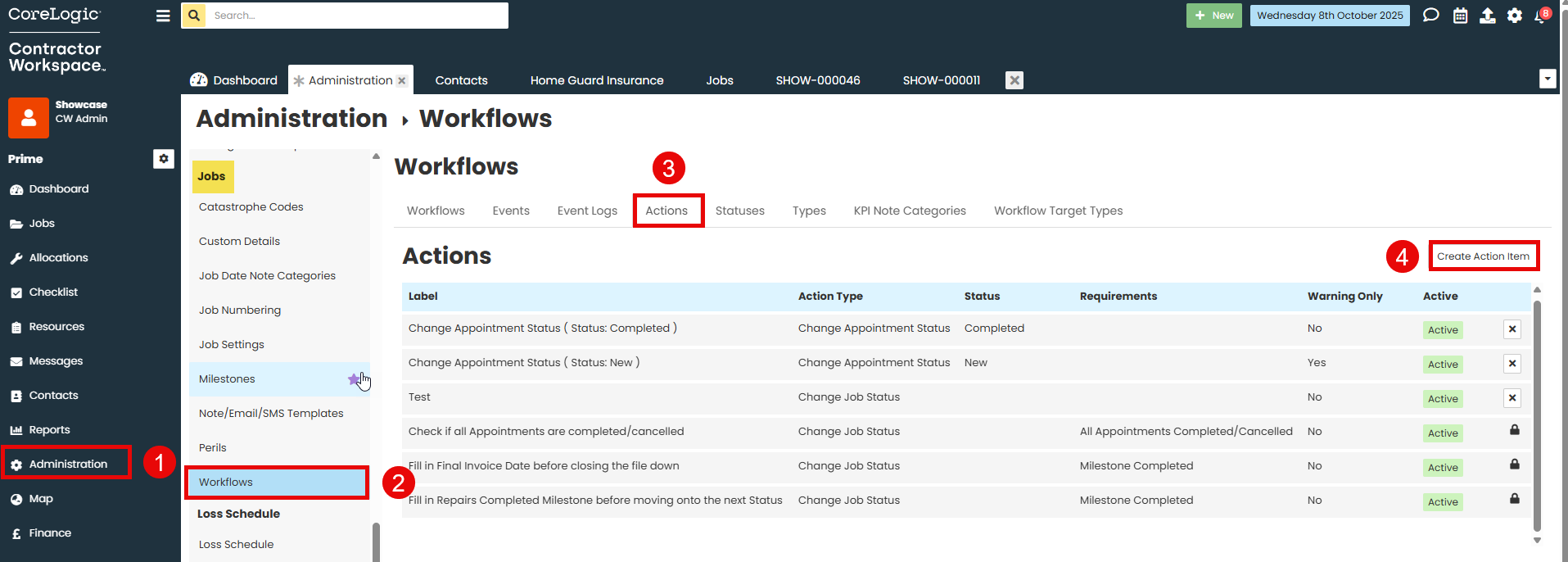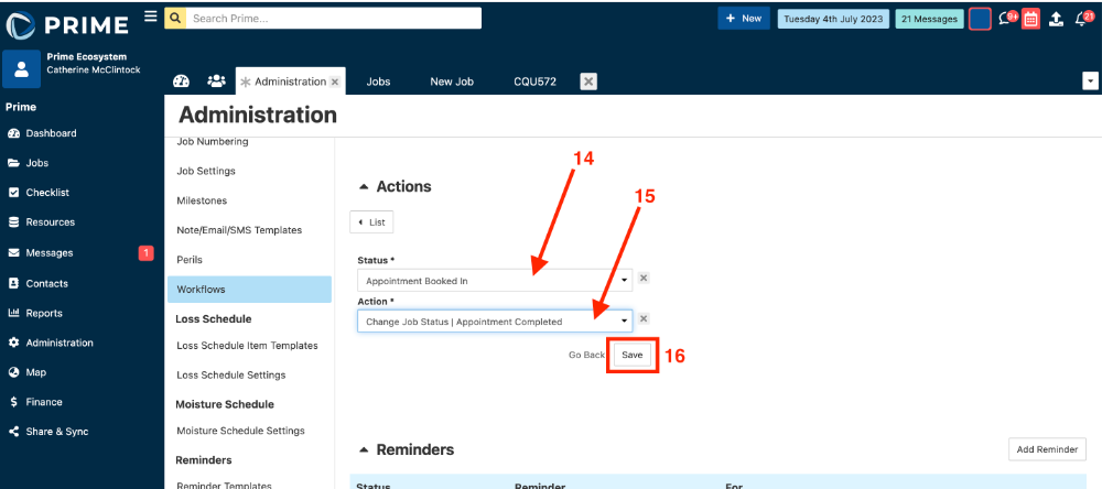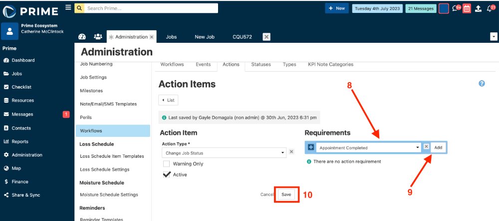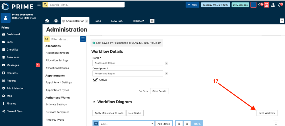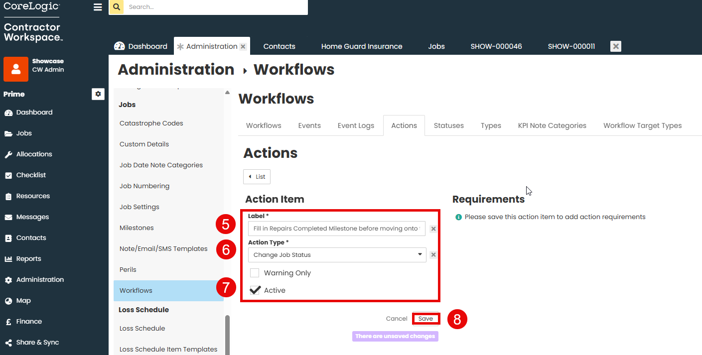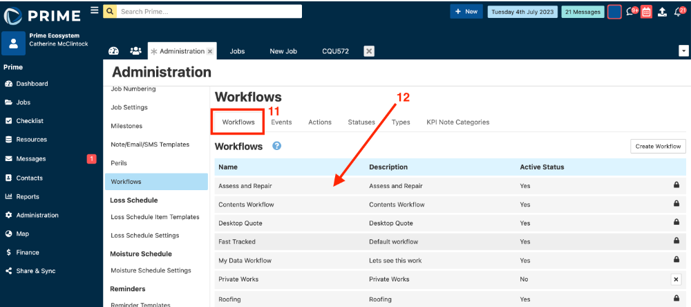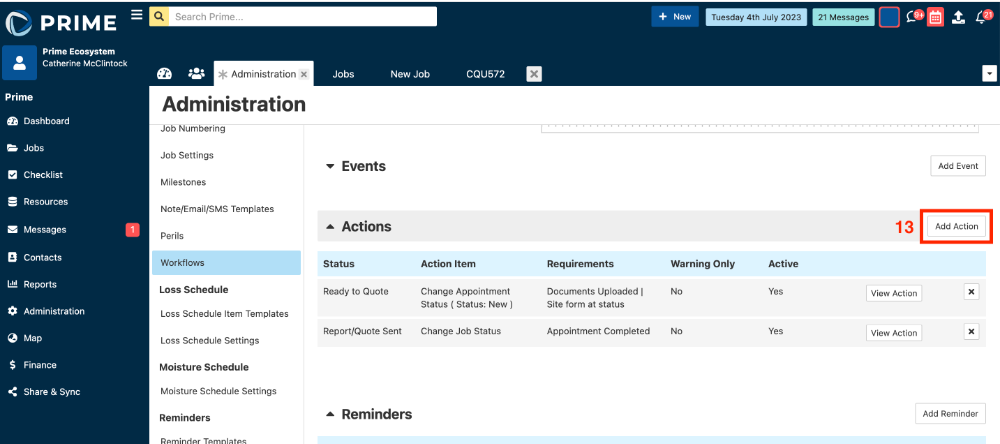 - The action now needs to be added to the workflow to apply to jobs. Click onto the Workflows tab.