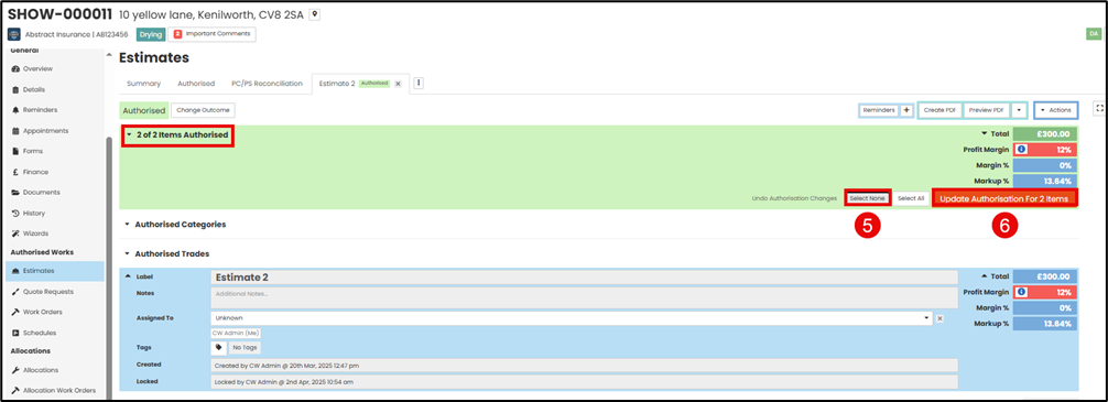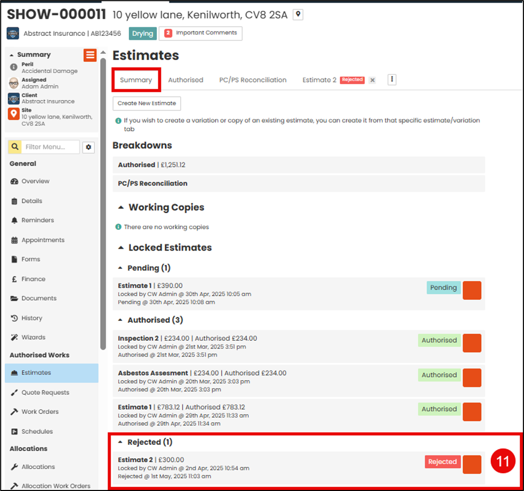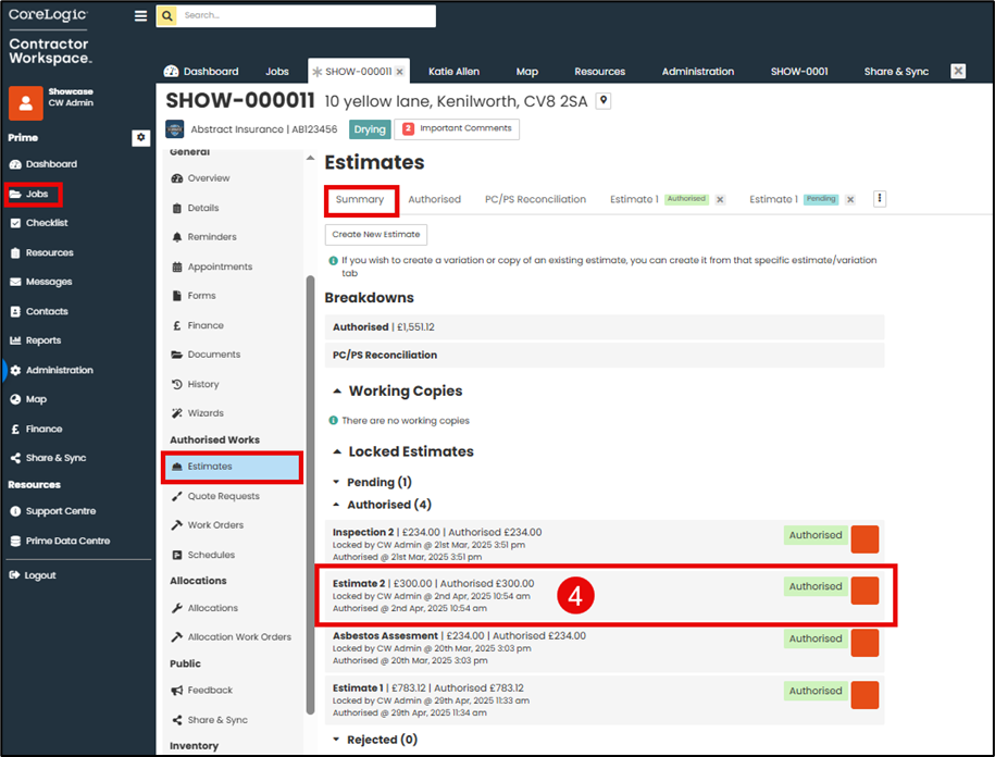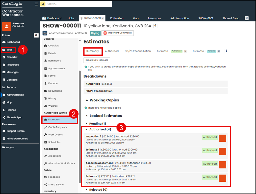 Locked and authorised estimates will be displayed in the Estimates Summary tab