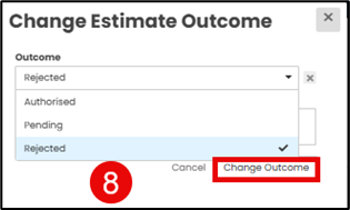 Change Estimate Outcome pop up will appear. Use the drop down to select the new status (Pending or Rejected). Then click Change Outcome.