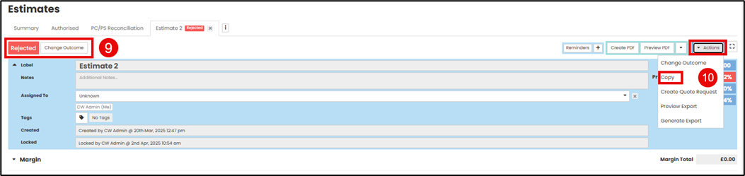 Estimate now appears as Rejected/Pending. You can change the outcome again if required