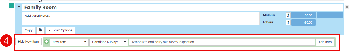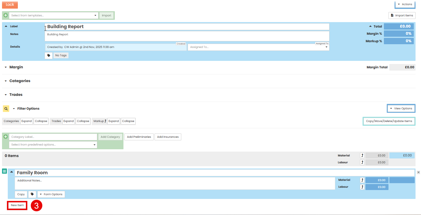 Use the New Item option to create a manual item. Select the Trade from the drop down and the type the description in the text field, then click Add Item.