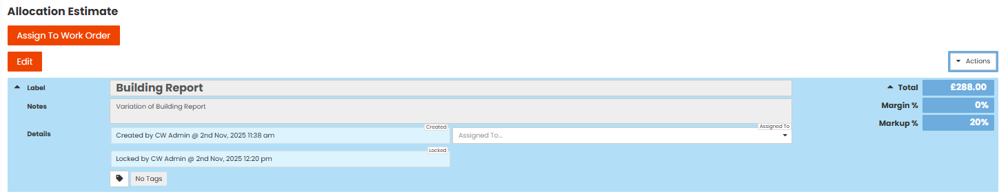 The page will refresh and you will now see two buttons at the top of the Allocation Estimate, 'Assign To Work Order' and 'Edit'. Use the Edit button to adjust the Allocation Estimate as required.