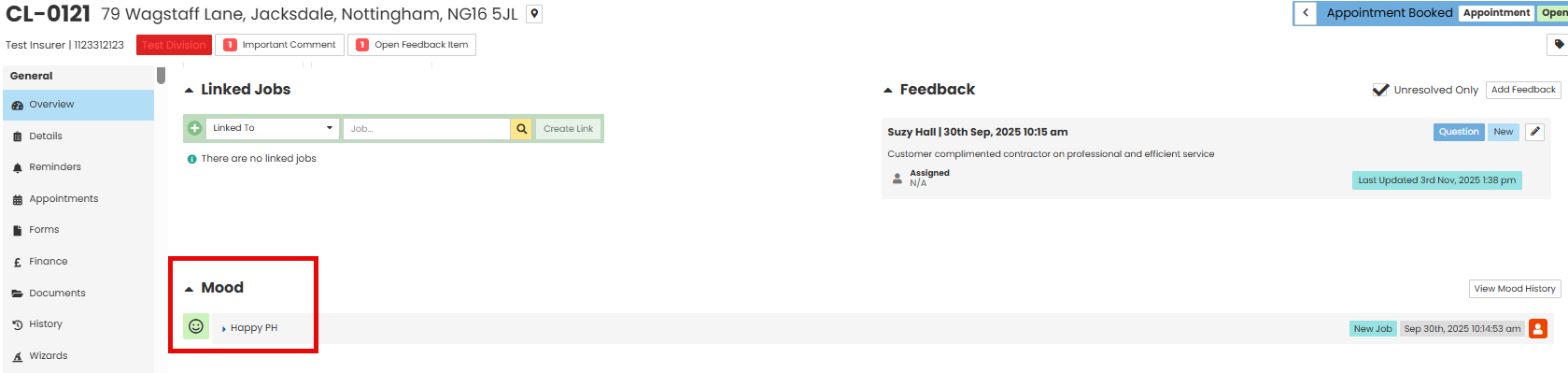 You can then also have a widget on the Job Overview page where you can see the current mood and any past history the mood was set to.