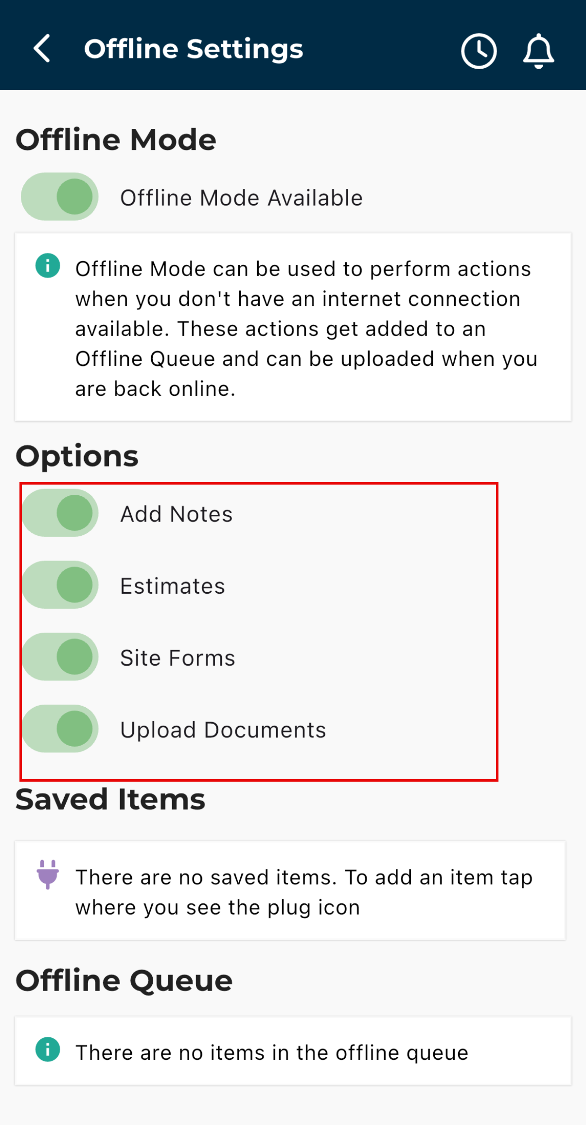 Further down the page you can see the ‘Offline Queue,’ here anything you have been doing while offline will appear here. When you reconnect to the internet, these items will automatically save.