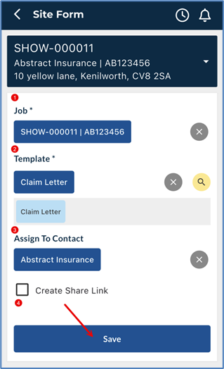 Choose the Job number you wish to link the form to, the site form template and who the form should be assigned to. If you wish to tick the Create Share link, an email will be sent to the Assignee with a link to the form for them to complete. Then click ‘Save’.