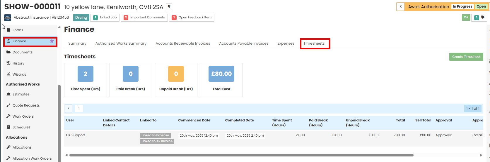 To view time sheets linked to the job go the ‘Finance’ in the ‘Job’.
