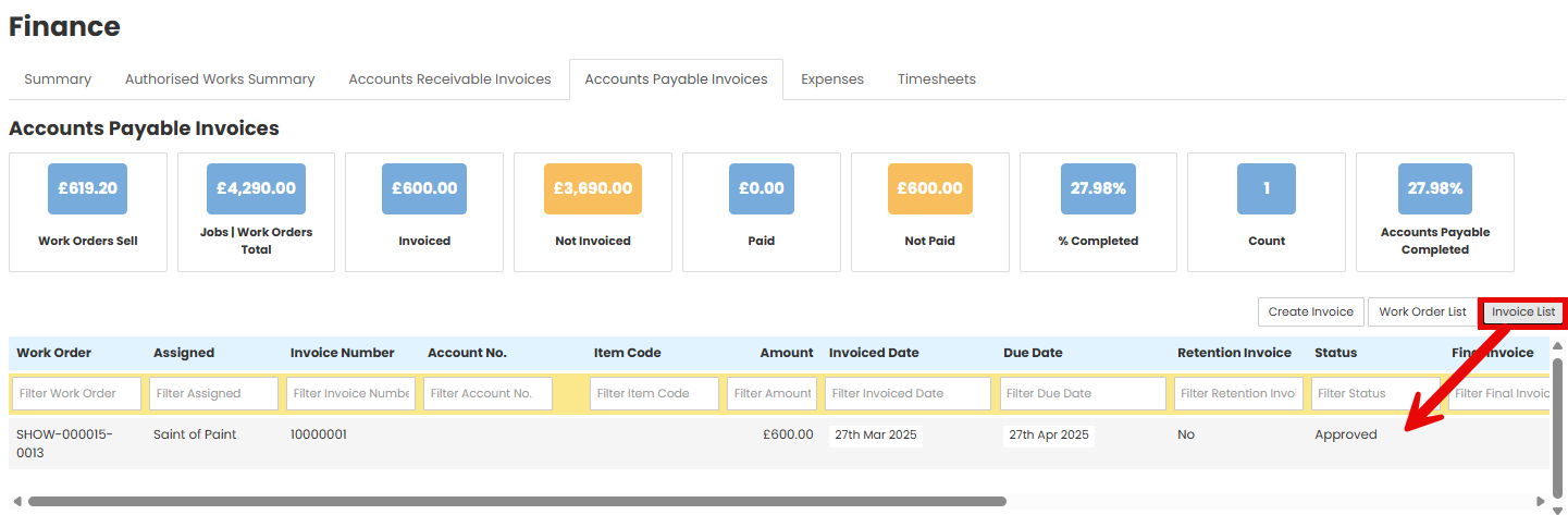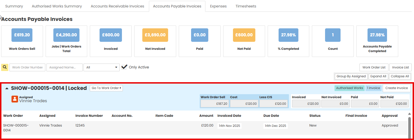 The p[age will refresh and take you back to the Accounts Payable Invoices tab. You will be able to see the invoice as the grey line under the Work Order details