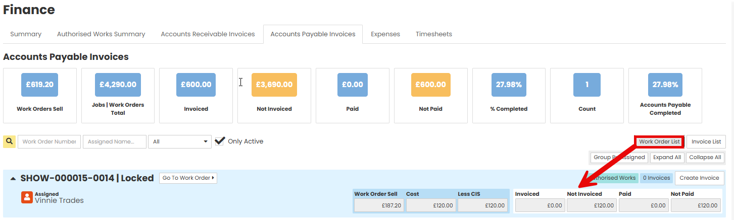Note -There are two views available: the ‘Work Order list’, where you can select a work order to create an invoice, and the ‘Invoice list’, is where you can create an invoice and then link it to a Work Order.