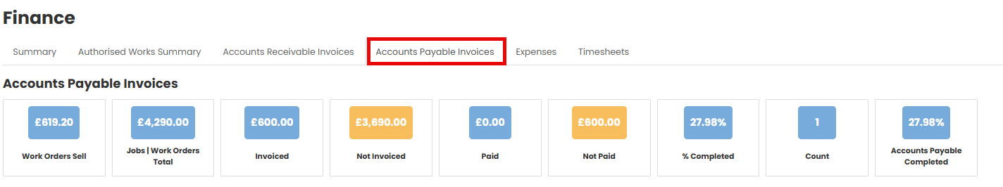 Navigate to the job the invoice is for, and select the Finance option from your Job menu.