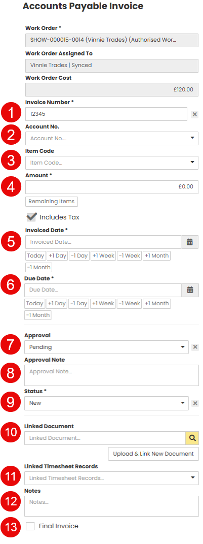 Final Invoice - Tick box you can select if the invoice entry is final. It will also move the Work Order status to complete if it isn't already