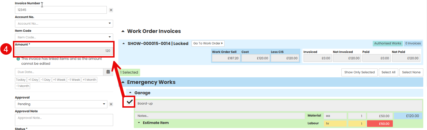 Amount - You can either use the tick box next to the line item on the right hand side to pull the value into the amount, or you can manually enter the value into the amount field.