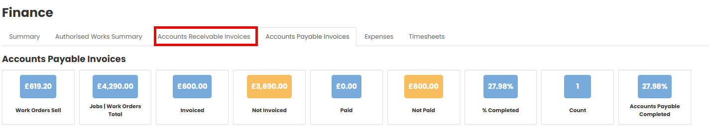Navigate to the job the invoice is for, and select the Finance option from your Job menu.