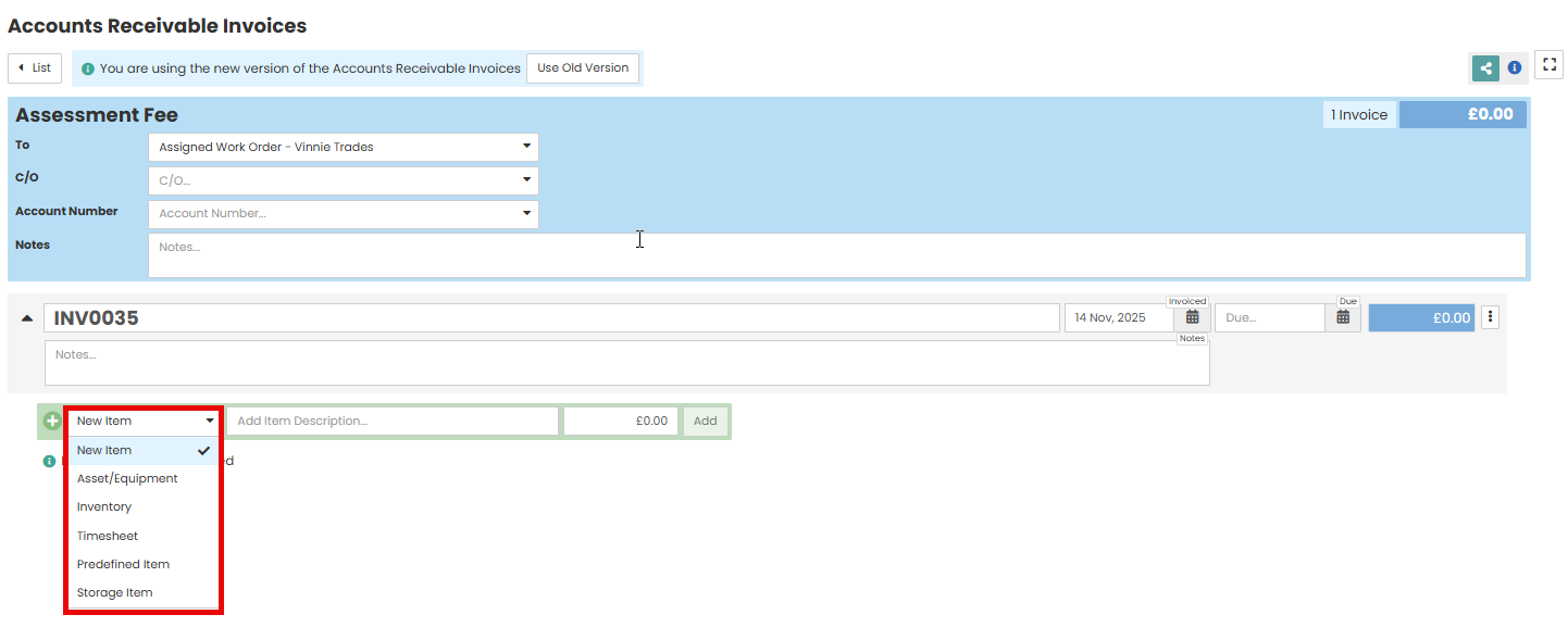 The standard list of items is: New Item (manual cost), Asset/Equipment, Inventory, Timesheet, Predefined Item and Storage Item. If creating either an allocation or authorised works invoice, then you will have the option to add the allocation or an estimate/authorised works items that are ready to invoice.