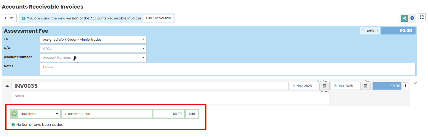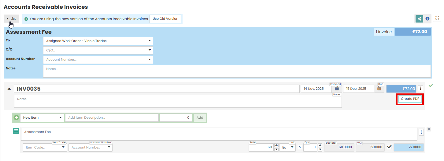 Create - You will be taken into the invoice where you can add items and costs.