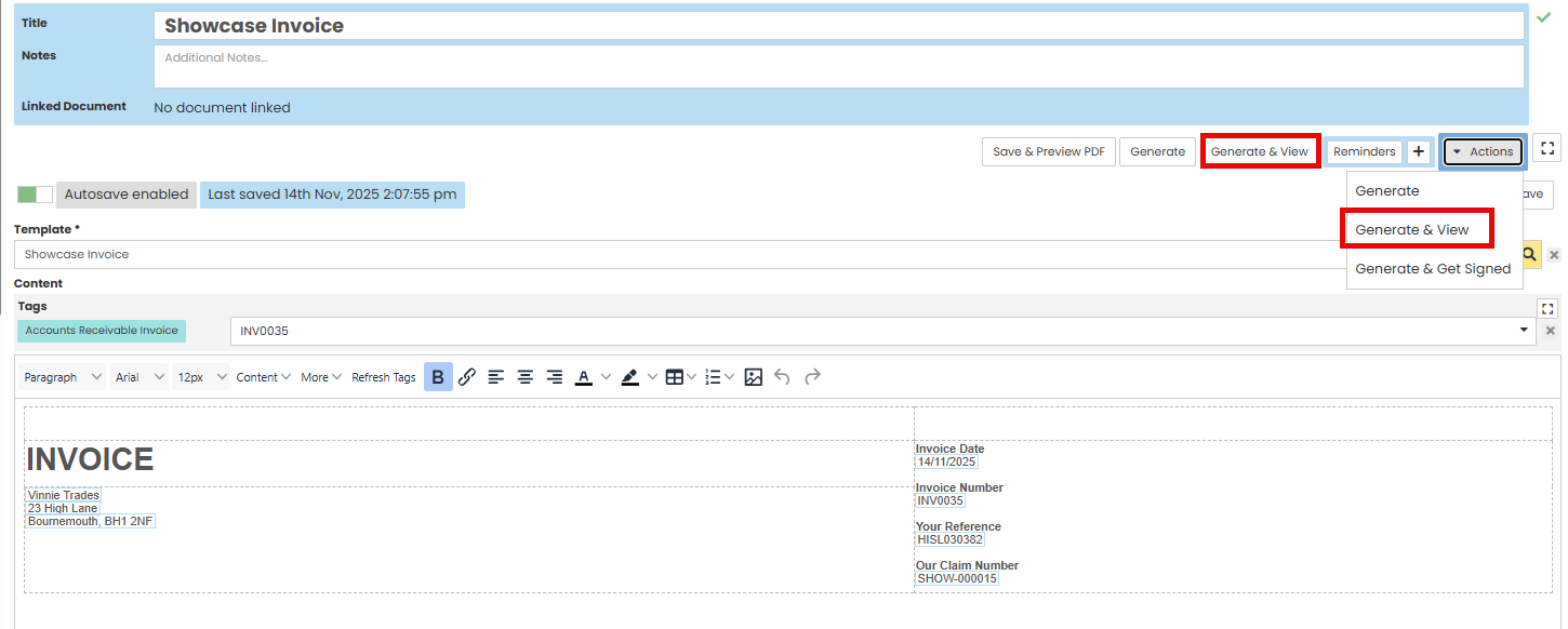 If the invoice is complete, select ‘Generate and View to preview the PDF invoice.