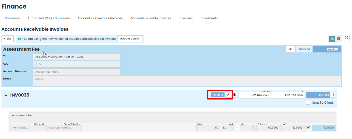 To send/ sync the AR Invoice to your accounting system, you will need to change the invoice status from the default ‘Pending’ to ‘Approved.’ Click pencil icon on the line item.