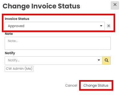 A pop up will appear, change the ‘Invoice Status’ to ‘Approved’ using the drop down menu. This will trigger the API connection to your company accounting system and send the invoice across.