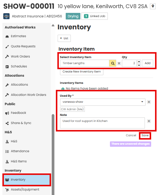 From within the job menu select Inventory. Select the inventory Item and the Quantity required. Click Add
