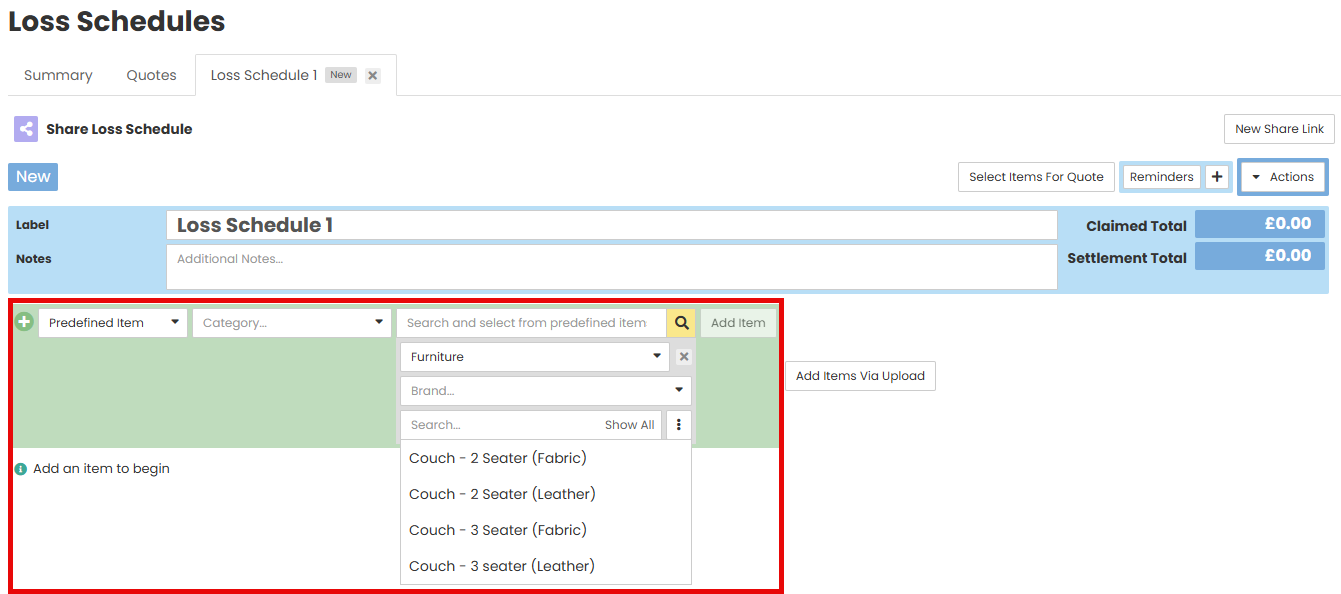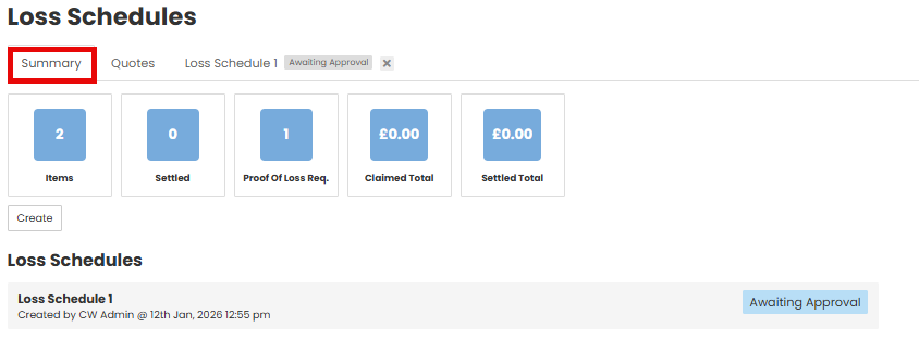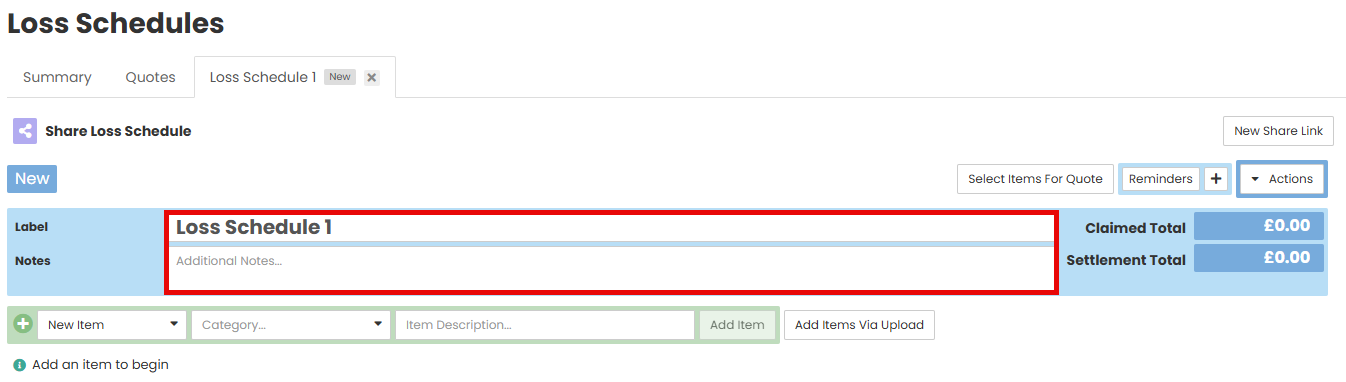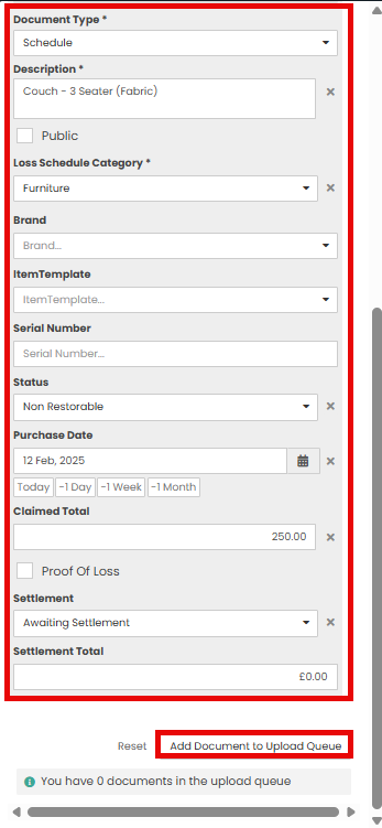 Upload the document to the upload queue. The Loss Schedule will update when the item is loaded.