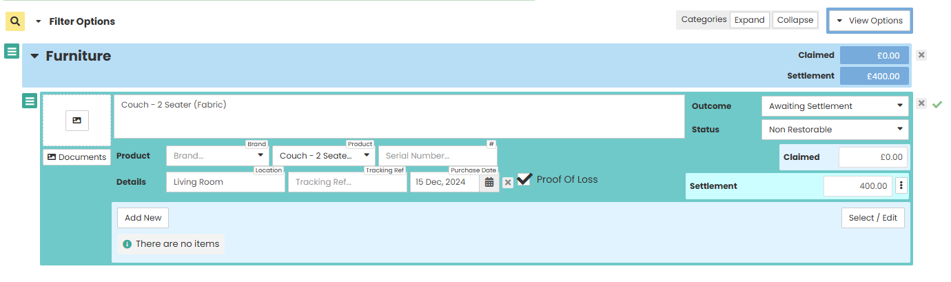 Once the item is added, you can add additional details such as purchase date, claim amount, settlement type etc.