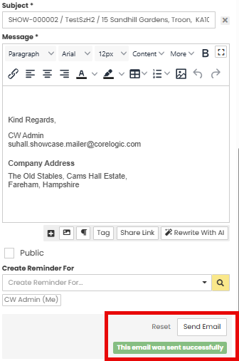 Once you are happy with your email click the Send Email button at the bottom of the screen. When the email has been sent you will see the green success message and the email form will reset itself.