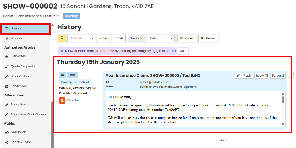 The history will log the email and be shown as below.