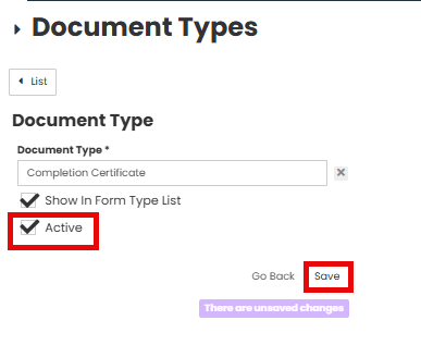 Ensure the Active box is checked (you can uncheck this in future if you wish to make a document type not visible)