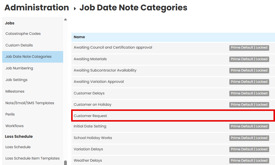Contractor Workspace has several existing, default job date note Categories that are locked, but custom categories can be added.